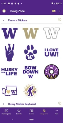 •Check out the Dawg Zone! Share UW stickers with friends and sample uniquely UW sounds including the UW’s fight song “Bow Down to Washington”